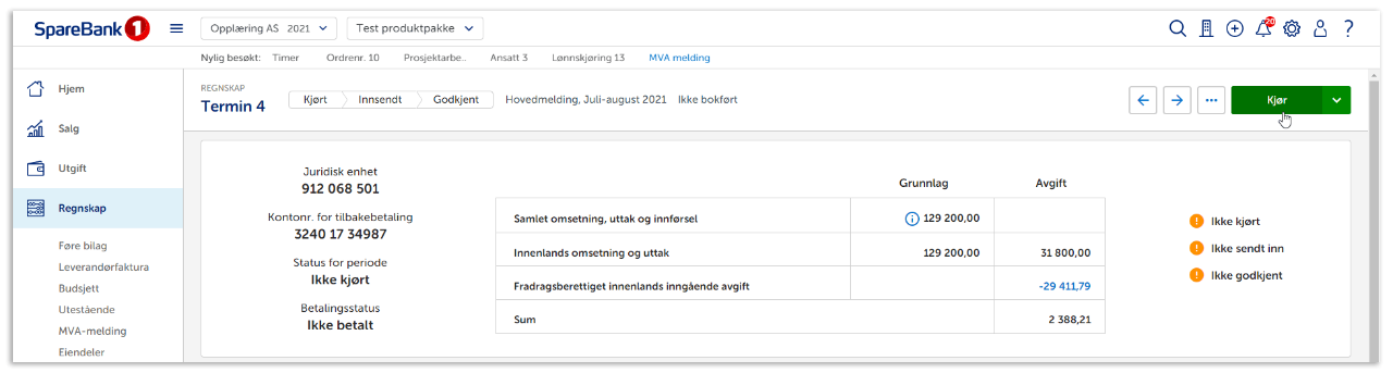 2. Trykk Kjør Skattemeldingen blir opprettet, men ikke sendt. Du kan angre kjøringen når som helst.