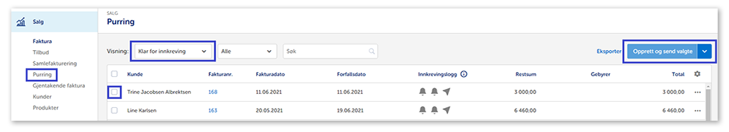 1. Gå til Salg og Purring i menyen. Fakturaer som har forfalt, dukker opp i listen under Klar for innkreving når forfallsdato er passert med tre dager.