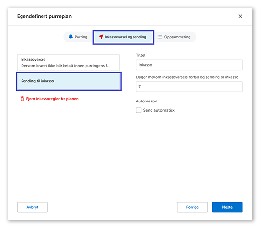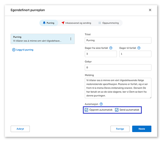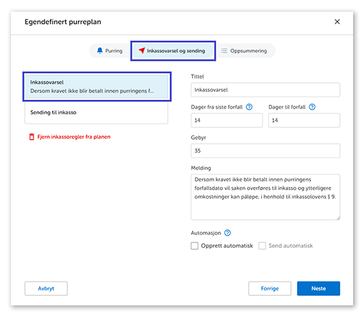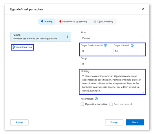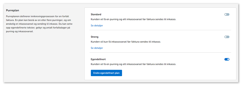 Under Egendefinert plan kan du endre purreteksten, forfallsdager og antall purringer.