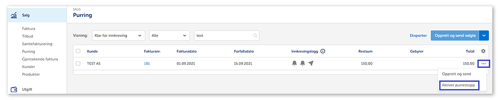 Er det noen fakturaer du ikke ønsker å purre på i det hele tatt, selv om den har forfalt, kan du velge Aktiver purrestopp under Salg og Purring i menyen. Da vil fakturaen fjerne seg fra listen over fakturaer som er klar for innkreving.