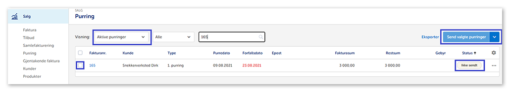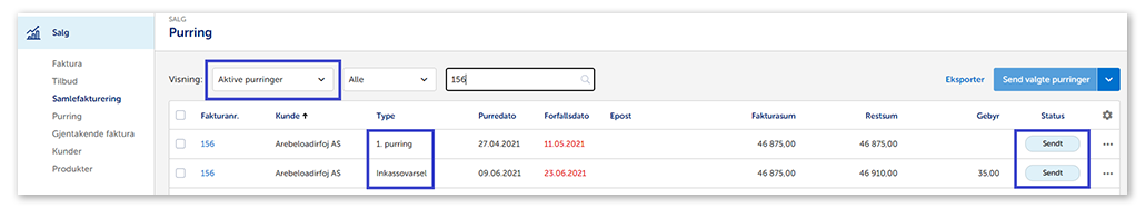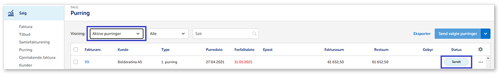 3. Bytt visning til Aktive purringer, så ser du at status endres til Sendt.