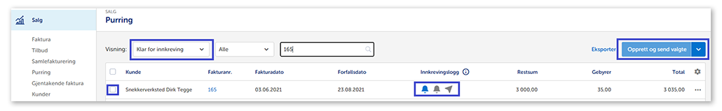 1. Gå til Salg og Purring i menyen. Fem dager etter at forfallsdato på purringen er passert, legger fakturaen seg under Klar for innkreving, nå med en blå bjelle under innkrevingsloggen. Innkrevingsloggen viser hvor langt du har kommet i innkrevingsløpet.