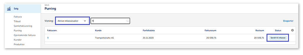 Når du har sendt fakturaene til inkasso, vil de aktive inkassosakene flytte seg til Aktive inkassosaker.