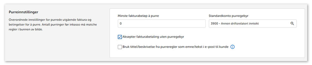 Minste fakturabeløp å purre på står som standard på null kroner. Setter du denne høyere vil de forfalte fakturaene, som er under beløpet du velger, ikke komme opp i listen som klare til innkreving.