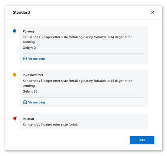 Her kan du velge hvor streng du vil være med kunden og hvor mange påminnelser du vil at kunden skal få før du sender det videre til inkasso.