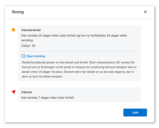 Under innkrevingsloggen ser du hvor langt i løpet forsøket på innkreving har kommet. Neste steg er inkasso.