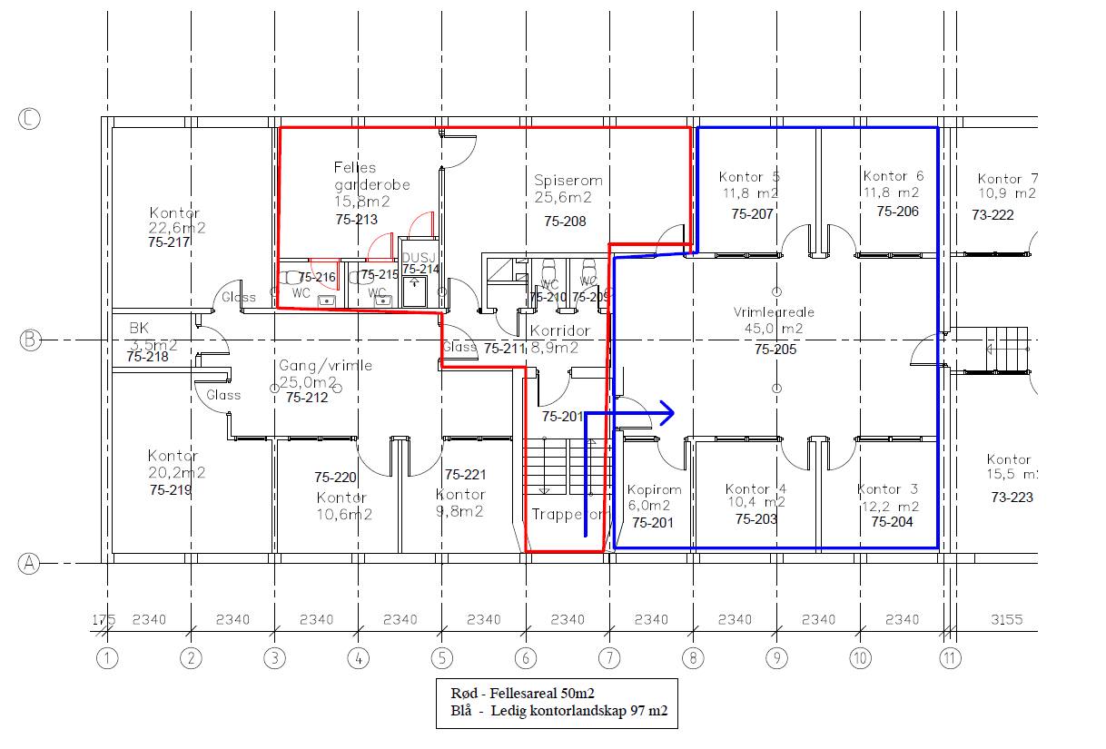 Kontorlokalene består av 97 kvm fordelt på vrimleområde og 4 cellekontor. Her er det mulighet for ombygging basert på leietakerens ønsker.