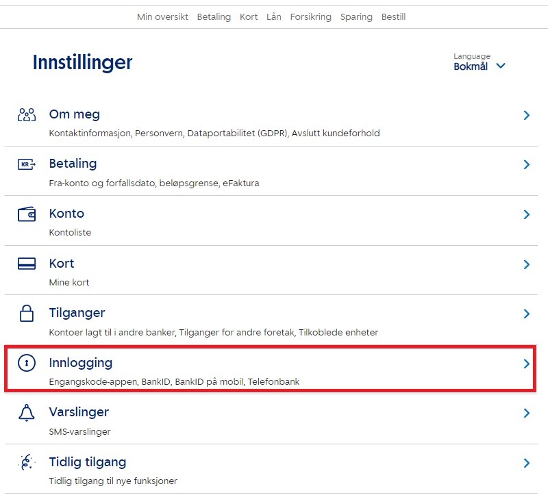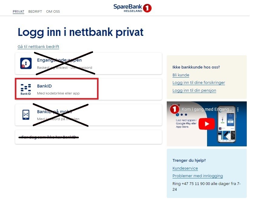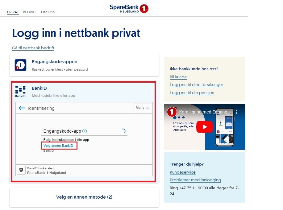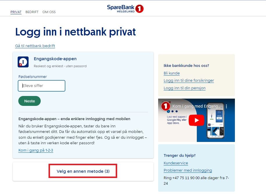 Logg inn med ditt fødselsnummer. Du bruker så din kodebrikke eller Engangskode-appen, pluss ditt personlige BankID-passord for å gå videre. Vises ikke riktig metode, klikk på "Velg en annen BankID".