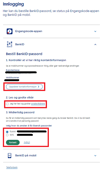 Kontroller at din kontaktinformasjon er riktig. Huk av for at du har lest og godtatt avtalevilkårene. Velg om du vil ha midlertidig passord tilsendt på e-post eller SMS. Det midlertidige passordet vil du få bruk for i et senere steg. Trykk "Fortsett".