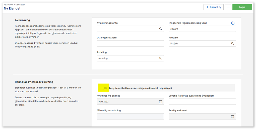 4. Huk av La systemet bokføre automatisk i regnskapet for at avskrivingen skal bokføres fortløpende. Vi anbefaler at du huker av for dette. Alternativet er at du manuelt kjører avskrivningen, for eksempel i forbindelse med årsavslutning.