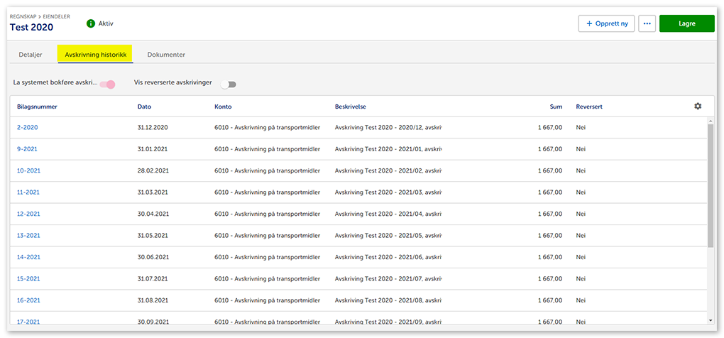 7. Trykk Lagre for å starte avskrivningene. Du ser avskrivningene under menyen Avskrivningshistorikk på den aktuelle eiendelen.