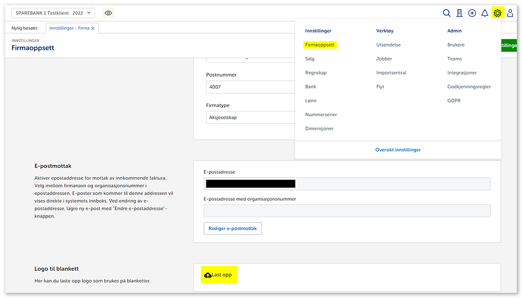 1. Gå til Innstillinger og velg Firmaoppsett.