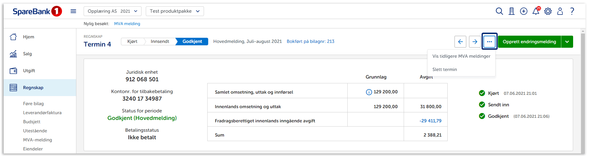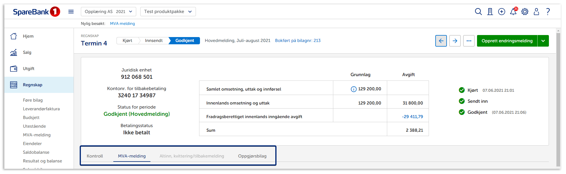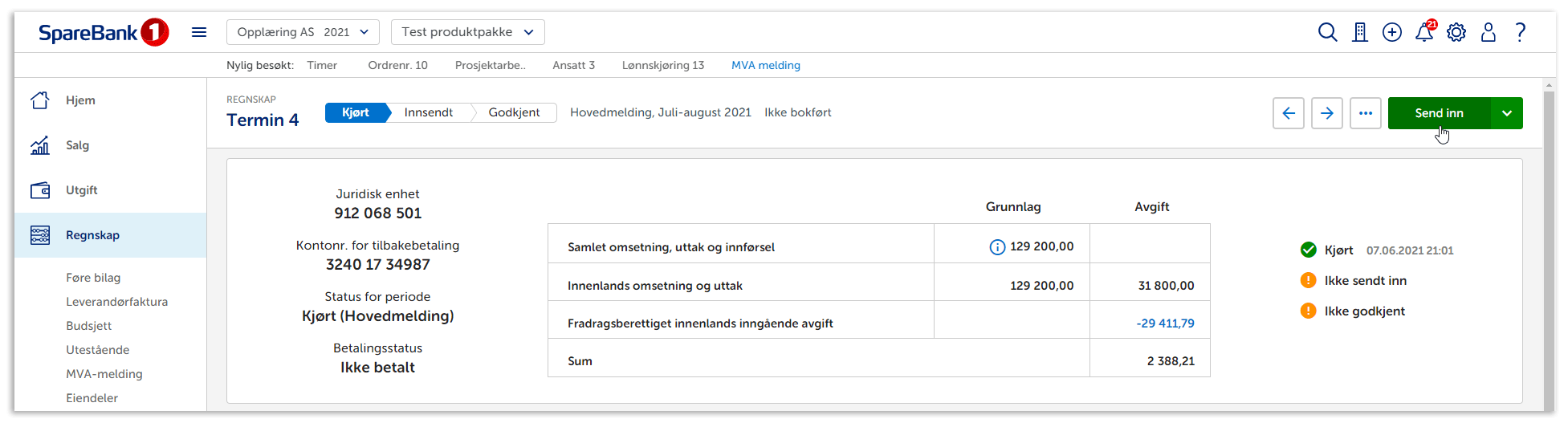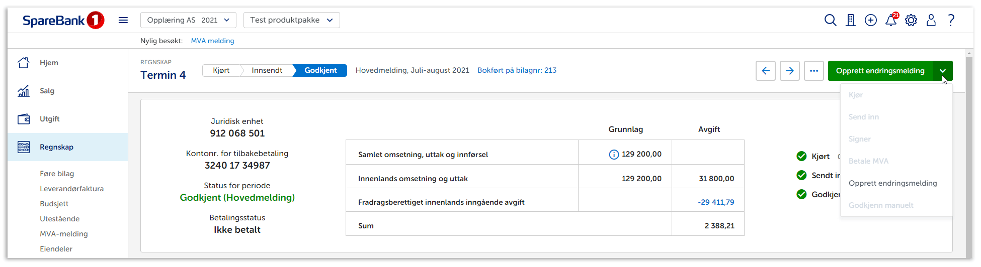 Mva-meldingen blir sendt inn. For at du skal kunne sende inn mva-meldingen og signere i SpareBank 1 Regnskap må du ha laget passord i Altinn.