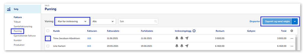 1. Gå til Salg og Purring i menyen. Fakturaer som har forfalt, dukker opp i listen under Klar for innkreving når forfallsdato er passert med tre dager.