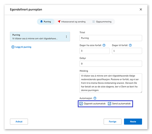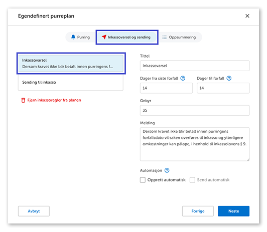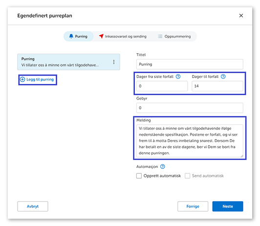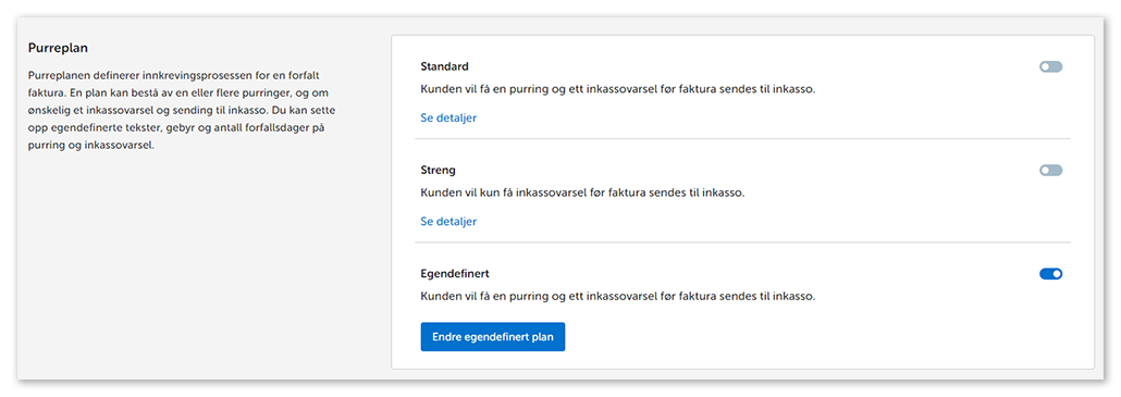 Under Egendefinert plan kan du endre purreteksten, forfallsdager og antall purringer.