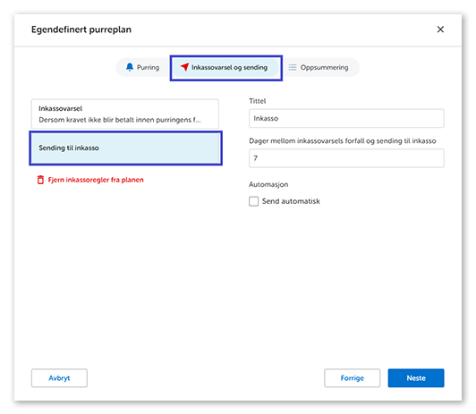 Under Sending til inkasso kan du endre antall dager før den kommer opp i Klar for innkreving.