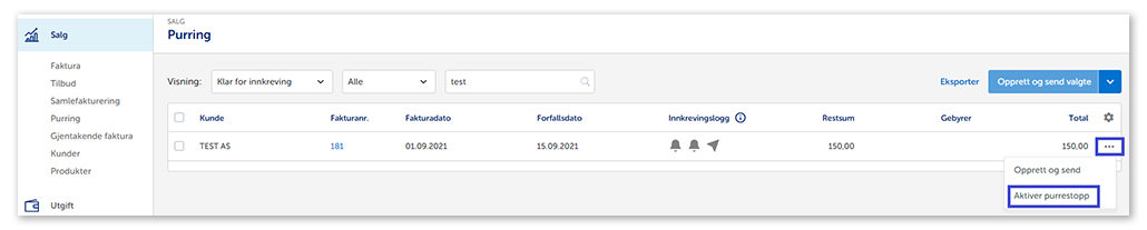 Er det noen fakturaer du ikke ønsker å purre på i det hele tatt, selv om den har forfalt, kan du velge Aktiver purrestopp under Salg og Purring i menyen. Da vil fakturaen fjerne seg fra listen over fakturaer som er klar for innkreving.