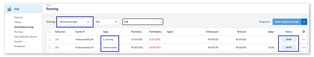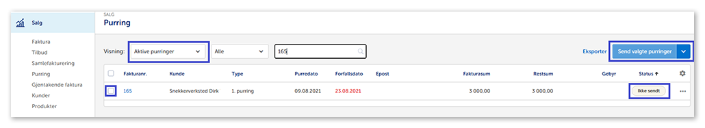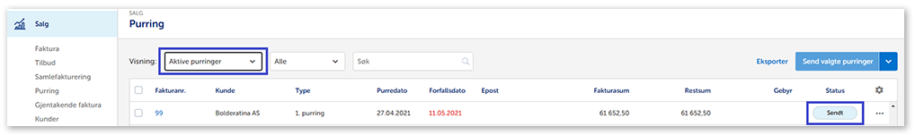 3. Bytt visning til Aktive purringer, så ser du at status endres til Sendt.