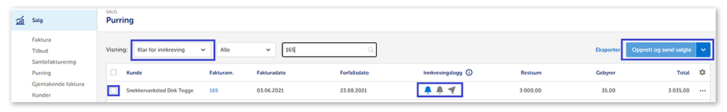 1. Gå til Salg og Purring i menyen. Fem dager etter at forfallsdato på purringen er passert, legger fakturaen seg under Klar for innkreving, nå med en blå bjelle under innkrevingsloggen. Innkrevingsloggen viser hvor langt du har kommet i innkrevingsløpet.