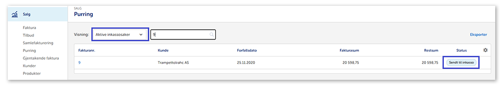 Når du har sendt fakturaene til inkasso, vil de aktive inkassosakene flytte seg til Aktive inkassosaker.