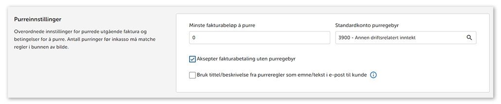 Minste fakturabeløp å purre på står som standard på null kroner. Setter du denne høyere vil de forfalte fakturaene, som er under beløpet du velger, ikke komme opp i listen som klare til innkreving.