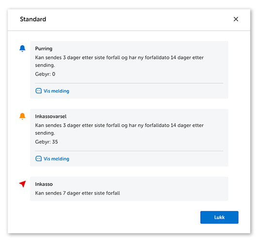 Her kan du velge hvor streng du vil være med kunden og hvor mange påminnelser du vil at kunden skal få før du sender det videre til inkasso.