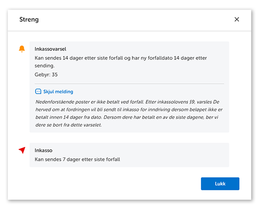 Under innkrevingsloggen ser du hvor langt i løpet forsøket på innkreving har kommet. Neste steg er inkasso.