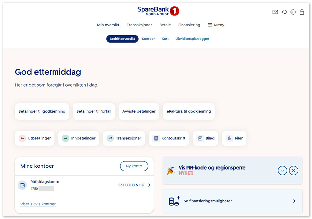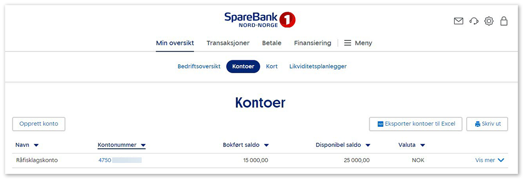 Beløpet som vises på oversiktssiden i nettbanken, er disponibel saldo. Det vil si penger du har tilgjengelig. Beløpet inkluderer det du hadde på konto fra før pluss kreditten du er innvilget som forskudd på levert fangst.
