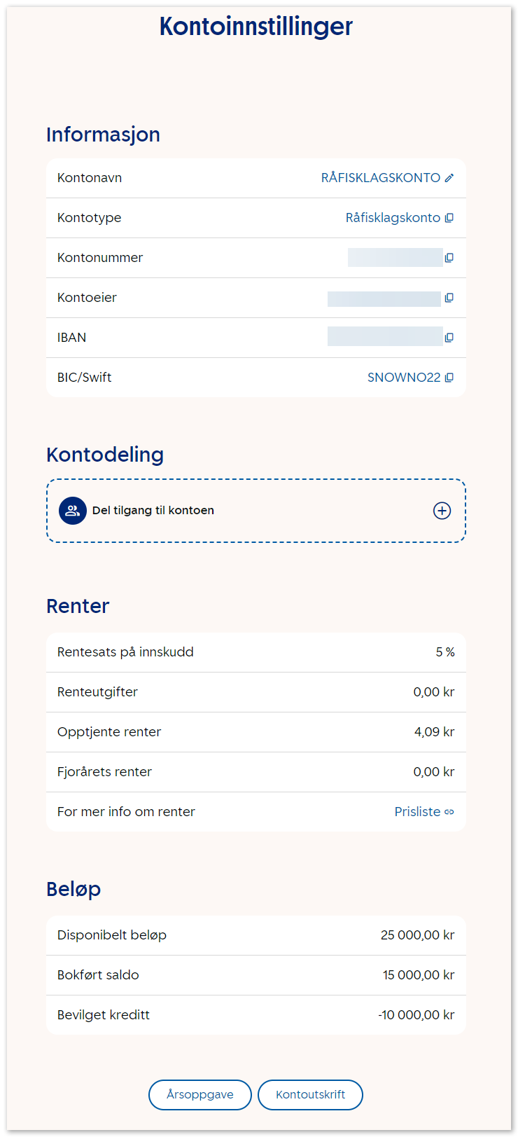 Under Kontoinnstillinger finner du all informasjon om Råfisklagskontoen. Nederst ser du disponibelt beløp, bokført saldo (det du hadde på konto fra før) og bevilget kreditt (kredittramme basert på levert fangst).