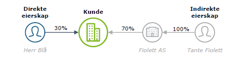 Figuren viser en forenklet modell av direkte og indirekte eierskap ved at Herr Blå er en direkte eier (30 %). Tante Fiolett er en indirekte eier gjennom sin 70 % eierandel i Fiolett AS.