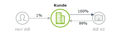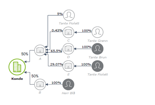 Eksempelet viser flere nivå av indirekte eierskap. I tidligere lov beregnet man % av %, som ville betydd at Tante Fiolett ville hatt 14,85 % eierinteresse i kunden (50 % * 29,07 %).