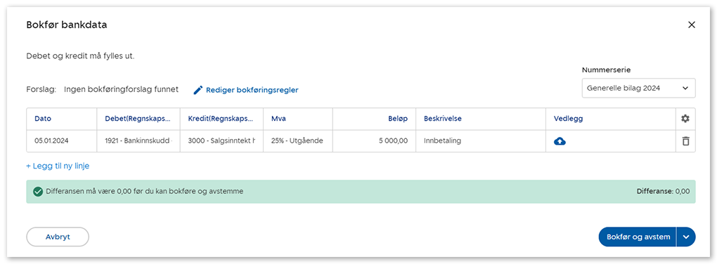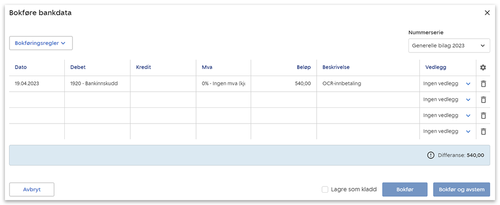 Inn- og utbetalinger kan enkelt bokføres direkte fra bankavstemmingsbildet, enten per transaksjon eller samlet. Du kan også sette opp egne bokføringsregler i bankavstemming som gjør at systemet automatisk foreslår konto for postering.