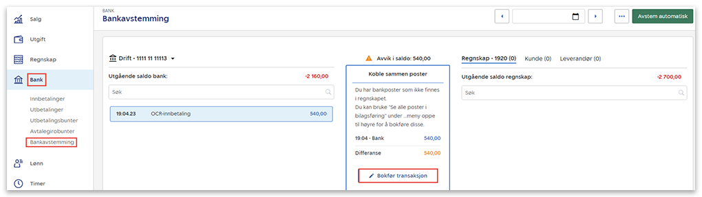 1. Gå til Bank i venstremenyen og velg Bankavstemming.