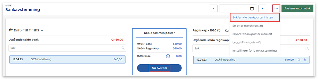 Bokfører du uten å avstemme, dukker bokføringen opp som en egen linje på regnskapssiden, og du kan enkelt avstemme postene. Ved å klikke på de tre prikkene kan du velge Bokfør alle bankposter i listen. Da får du opp alle bankpostene som er åpne. Bokføringen fungerer tilsvarende som forklart over.