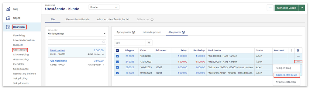 Du kan registrere en tilbakebetaling til kunder og leverandører, for eksempel hvis det har blitt betalt for mye eller det er avvik i det betalte beløpet. Merk at kun negative restbeløp kan utbetales fra leverandører.