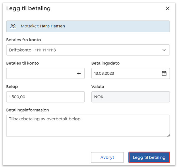 5. Du vil se en oversikt over betalingsdetaljene, og disse kan fritt endres. Vær spesielt oppmerksom på at beløpet og kunden/leverandørens kontonummer er korrekte. Når du velger Legg til betaling, vil denne betalingen legges til i utbetalingslisten i bankmodulen.