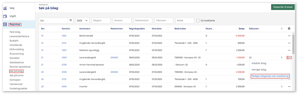 2. Klikk på de tre kulepunktene i den aktuelle bilagslinjen og velg Rediger bilagslinje uten kreditering.