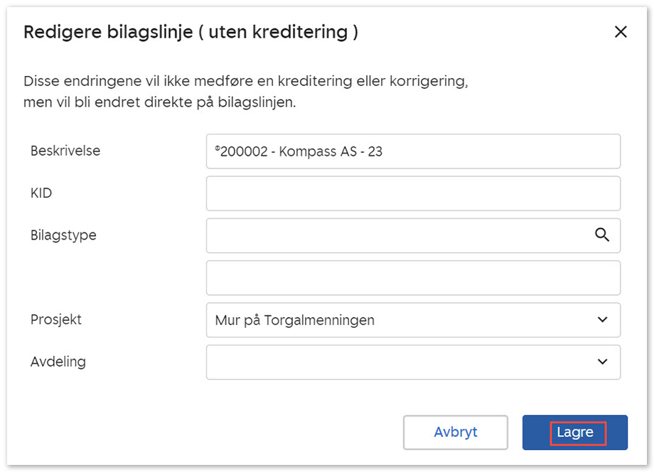 Følgende variabler kan redigeres uten å kreditere eller korrigere hele bilaget: beskrivelse, KID, bilagstype, prosjekt og avdeling.