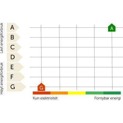 Bokstavene fra A til G er karakteren på hvor mye energi som kreves for å varme opp huset. A er et topp moderne, godt isolert hus. G er et eldre hus med isolasjon under dagens standarder. Fargeskalaen går fra rød til grønn, hvor rød farge betyr at hus og varmtvann kun er oppvarmet med elektrisitet. Bruk av fornybare energikilder bringer huset nærmere grønn status.