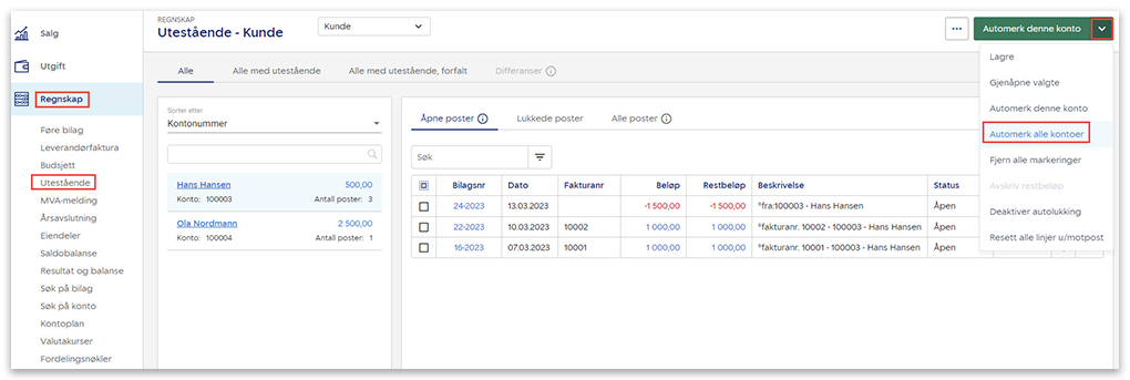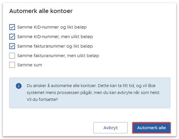 Du kan automerke åpne poster på alle kontoer i systemet. Alle poster som matcher kriteriene du har valgt vil automatisk lukkes. Vær oppmerksom på at dette vil gjøres for alle reskontroserier, kunder, leverandører og eventuelt andre serier, og ikke bare den valgte serien.