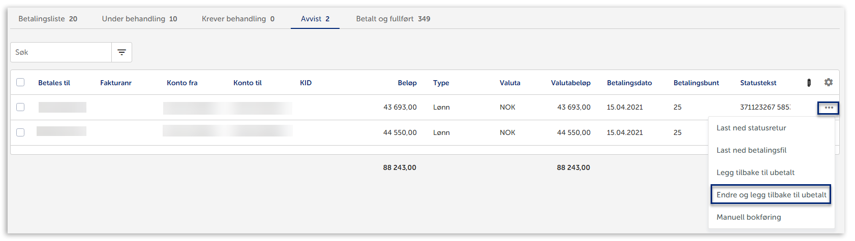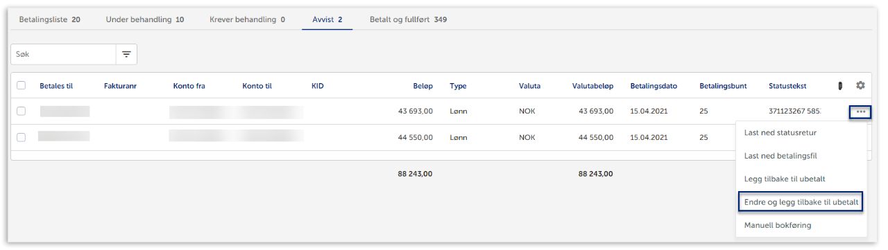 Du har mulighet til å endre betalingen og sette den som ubetalt ved å klikke på de tre prikkene til høyre for den avviste filen. Da vil filen legge seg i Betalingsliste og du kan sende den på nytt til banken for utbetaling.