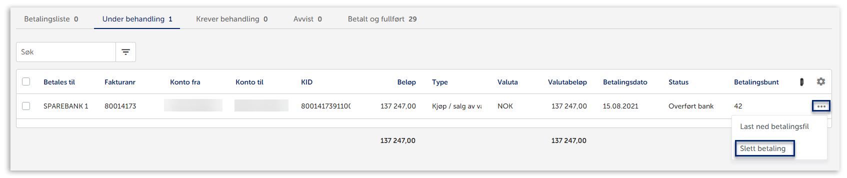 Her kan du se filene du har sendt over til banken. Du kan se status som sendes til bank og mottatt av bank. Mottatt av bank betyr at filen du har sendt over er mottatt av banken og ligger der til godkjenning og/eller utbetaling. En fil som er sendt over til banken vil ligge her helt til den blir betalt. Skal du slette en betaling som ligger under behandling, klikker du på de 3 prikkene til høyre på linjen.