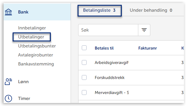 Du får først tilgang til menypunktet Utbetaling etter at du har satt opp kobling mellom bank og regnskap.
