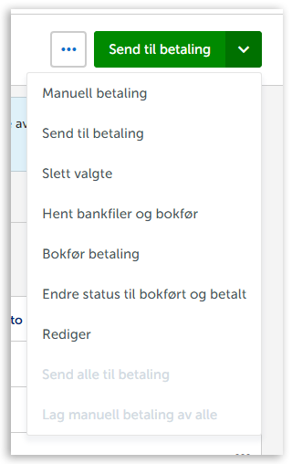 Her kan du også behandle betalingen manuelt. Har du for eksempel allerede  registrert betalingen manuelt i nettbanken, vil du kunne merke betalingen som en manuell betaling, bokføre den, eller merke den som betalt. Disse alternativene finner du under pilen ved siden av Send til betaling
