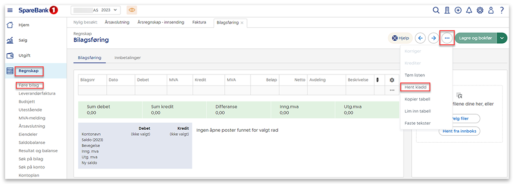 1. Gå til Regnskap i venstremenyen og velg Føre bilag.