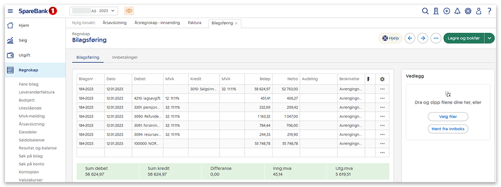 3. Trykk Lagre og bokfør. Nå er seddelen bokført.