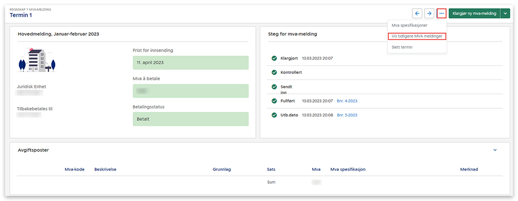 Hvis du tidligere har kjørt en mva-melding og slettet den, kan du fremdeles hente den frem for å se detaljene. Når du står i visningsbildet for en mva-melding, klikker du på de tre prikkene oppe til høyre. Velg deretter Vis tidligere mva-meldinger.