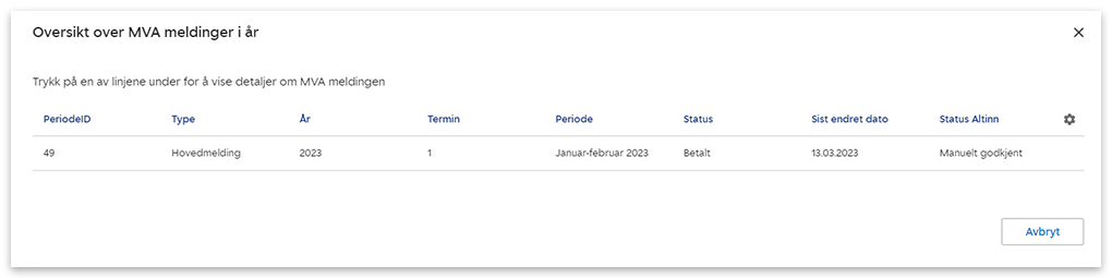 Mva-meldinger som er sendt inn og betalt vil ha status Betalt. Meldinger som er sendt inn, men ikke betalt, vil ha status Fullført. Meldinger som er slettet vil ha status Angret.