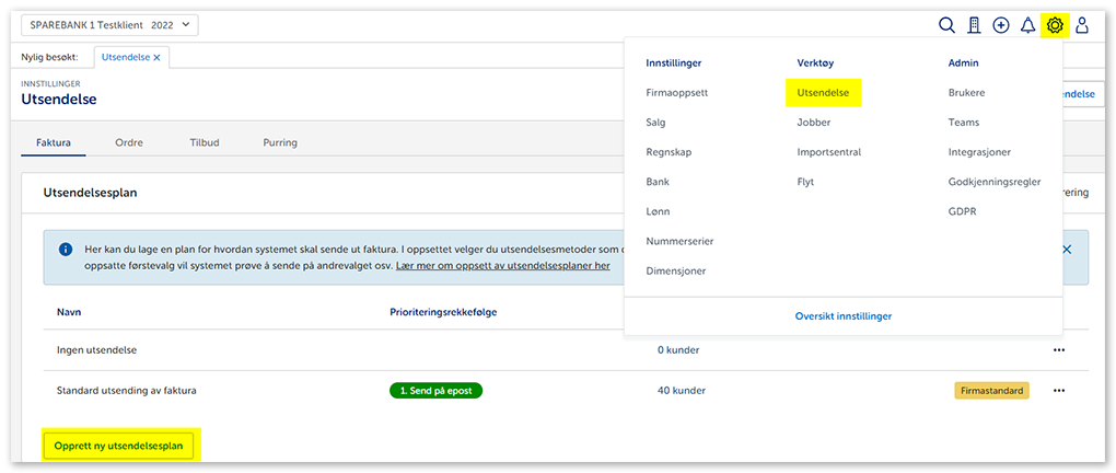 1. Gå til Innstillinger og Utsendelse. Under menyen Faktura finner du Utsendelsesplan. Trykk Opprett ny utsendelsesplan