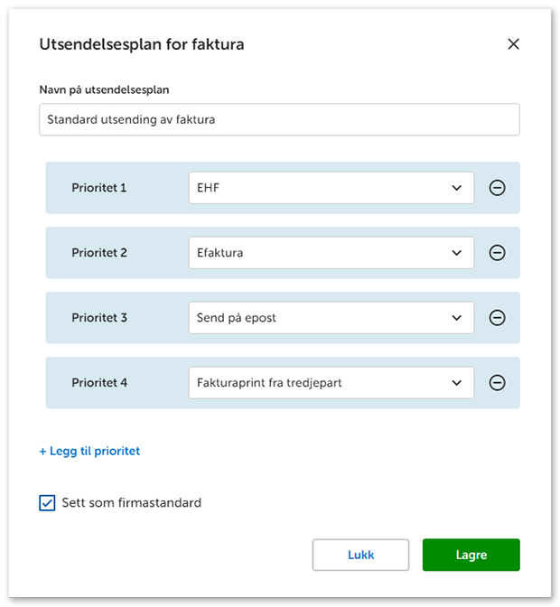 4. Husk å huke av for Sett som firmastandard og trykk Lagre. Planen din er nå synlig under Faktura